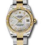 31mm stainless steel case, 18K yellow gold domed bezel set with 24 diamonds, mother of pearl dial, diamond hour markers, and stainless steel and 18K yellow gold Oyster bracelet.