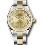 28mm yellow Rolesor case comprised of a 904L steel monobloc middle case, screw-down steel back, 18K yellow gold screw-down crown with twinlock double waterproofness system, 18K yellow gold domed bezel, scratch-resistant sapphire crystal with cyclops lens over the date and double anti-reflective coating, champagne dial, diamond hour markers, Rolex calibre 2236 automatic movement with center hour, minute and seconds hands, instantaneous date with rapid setting, and stop-seconds for precise time setting, yellow gold Rolesor Oyster bracelet comprised of a combination of 904L steel and 18K yellow gold in flat three-piece links, folding Oysterclasp buckle with Easylink 5mm comfort extension link. Waterproof to 100 meters.