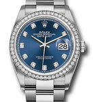 36mm Oystersteel case, screw-down steel back, screw-down crown with twinlock double waterproofness system, diamond bezel, scratch-resistant sapphire crystal with cyclops lens over the date, blue dial, diamond hour markers, Rolex calibre 3235 perpetual self-winding movement with center hour, minute and seconds hands, instantaneous date at 3 o'clock with rapid setting, and stop-seconds for precise time setting, approximately 70 hours of power reserve, Oyster bracelet with flat three-piece links, folding Oysterclasp buckle with Easylink 5mm comfort extension link. Waterproof to 100 meters. Baselworld 2019 release.