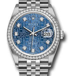 36mm Oystersteel case, screw-down steel back, screw-down crown with twinlock double waterproofness system, diamond bezel, scratch-resistant sapphire crystal with cyclops lens over the date, blue Jubilee dial, diamond hour markers, Rolex calibre 3235 perpetual self-winding movement with center hour, minute and seconds hands, instantaneous date at 3 o'clock with rapid setting, and stop-seconds for precise time setting, approximately 70 hours of power reserve, Jubilee bracelet with five-piece links, folding Oysterclasp buckle with Easylink 5mm comfort extension link. Waterproof to 100 meters. Baselworld 2019 release.