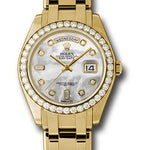 39mm yellow gold case, bezel set with 40 diamonds, mother of pearl dial, 8 round and 2 baguette diamond hour markers, yellow gold Oyster 20mm bracelet.