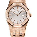 33 mm hammered 18K pink gold case, 7 mm thick, silver-toned dial with Grande Tapisserie pattern, pink gold applied hour-markers and Royal Oak hands with luminescent coating, Calibre 2713 movement with hours, minutes, date, hammered 18K pink gold bracelet, AP folding buckle. Water resistant to 50 m.