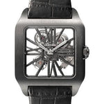 38.7mm x 47.4mm titanium case coated with ADLC, 9.4mm thick, octagonal crown set with a sapphire, sapphire crystal, satin brushed dial skeleton, caliber 9612 MC manual movement with skeletonized bridges in the form of Roman numerals, approximately 72 hours of power reserve, black alligator strap, double adjustable deployant buckle in 18K white gold. Water resistant to 30 meters.