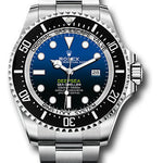 44mm oystersteel case with helium escape valve, screw-down back, screw-down crown, unidirectional rotating bezel with scratch-resistant ceramic Cerachrom insert and platinum coated 60-minute graduations and numerals, domed 5.5mm thick scratch-resistant crystal, d-blue dial with gradient from deep-blue to black, Rolex calibre 3235 perpetual self-winding movement, approximately 70 hours of power reserve, Oyster bracelet with flat three-piece links, folding Oysterlock safety buckle with Rolex glidelock extension system and fliplock extension link. Waterproof to 3,900 meters (12,800 feet). Redesigned for Baselworld 2018 with updated case sies, lugs, broader bracelet and clasp, and calibre 3235 movement.