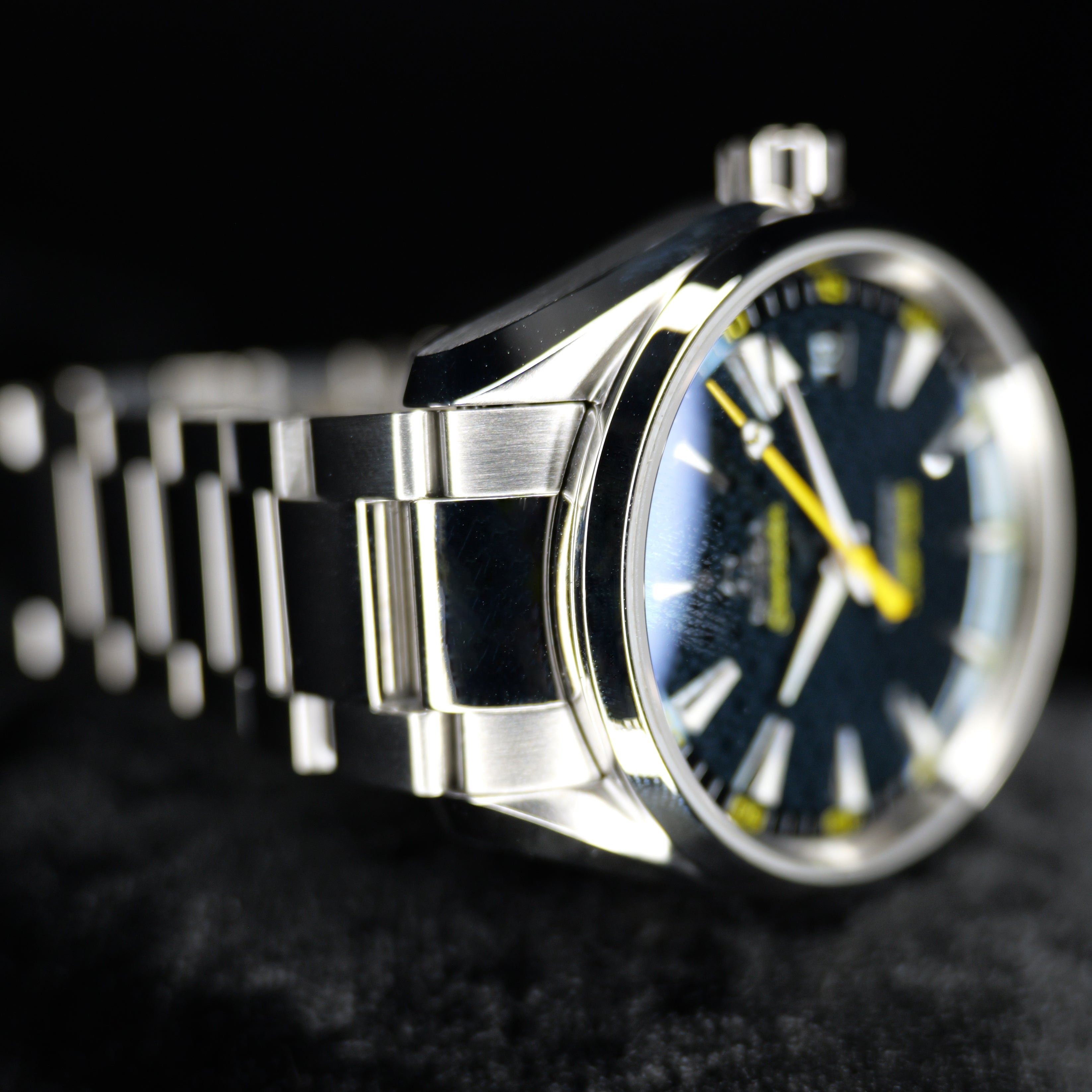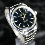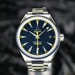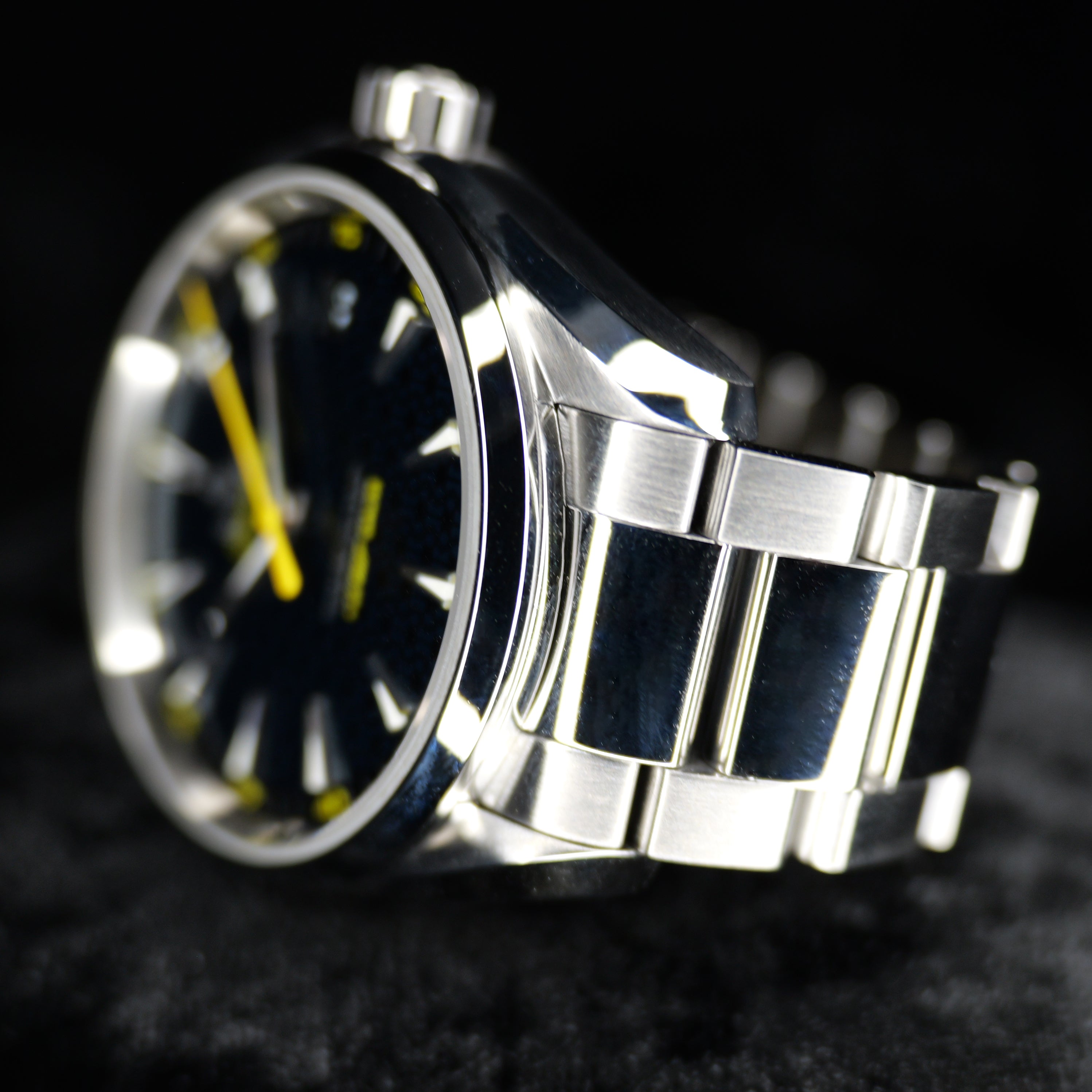 Up for sale is the Omega James Bond Spectre Seamaster Aqua Terra 231.10.42.21.03.004 41MM Steel Blue Dial with International warranty card, pictograms card, loop, extra strap, strap tool, extra spring bars, and is boxed. Watch is fitted to 19cm. Watch is dated 2017. MSRP $7,350. It was recently placed on a timegrapher and is running well. All of our watches are photographed under high intensity light with a macro lens. Any flaws will be significantly magnified. The serial numbers have been blurred for privacy. Timepiece is in excellent condition showing little to no signs of wear. Timepiece is located in Indiana.
