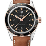 41 mm stainless steel case, transparent back, self-locking crown, 18K sedna gold unidirectional rotating bezel with ceramic ring, sapphire crystal with anti-reflective treatment inside, black dial 18K sedna gold hands, caliber 8400 self-winding movement, approximately 60 hours of power reserve, brown leather strap. Water resistant to 300 m (1000 ft).