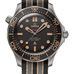 42 mm titanium case with anti-magnetic protection and helium escape valve, brown tropical aluminium bezel ring, domed scratch-resistant sapphire crystal with anti-reflective treatment inside, brown dial domed, scratch-resistant sapphire crystal with anti-reflective treatment inside, Calibre Omega 8806 self-winding co-axial master chronometer movement, approximately 55 hours of power reserve, striped NATO strap. Water resistant to 300 metres (1000 feet).