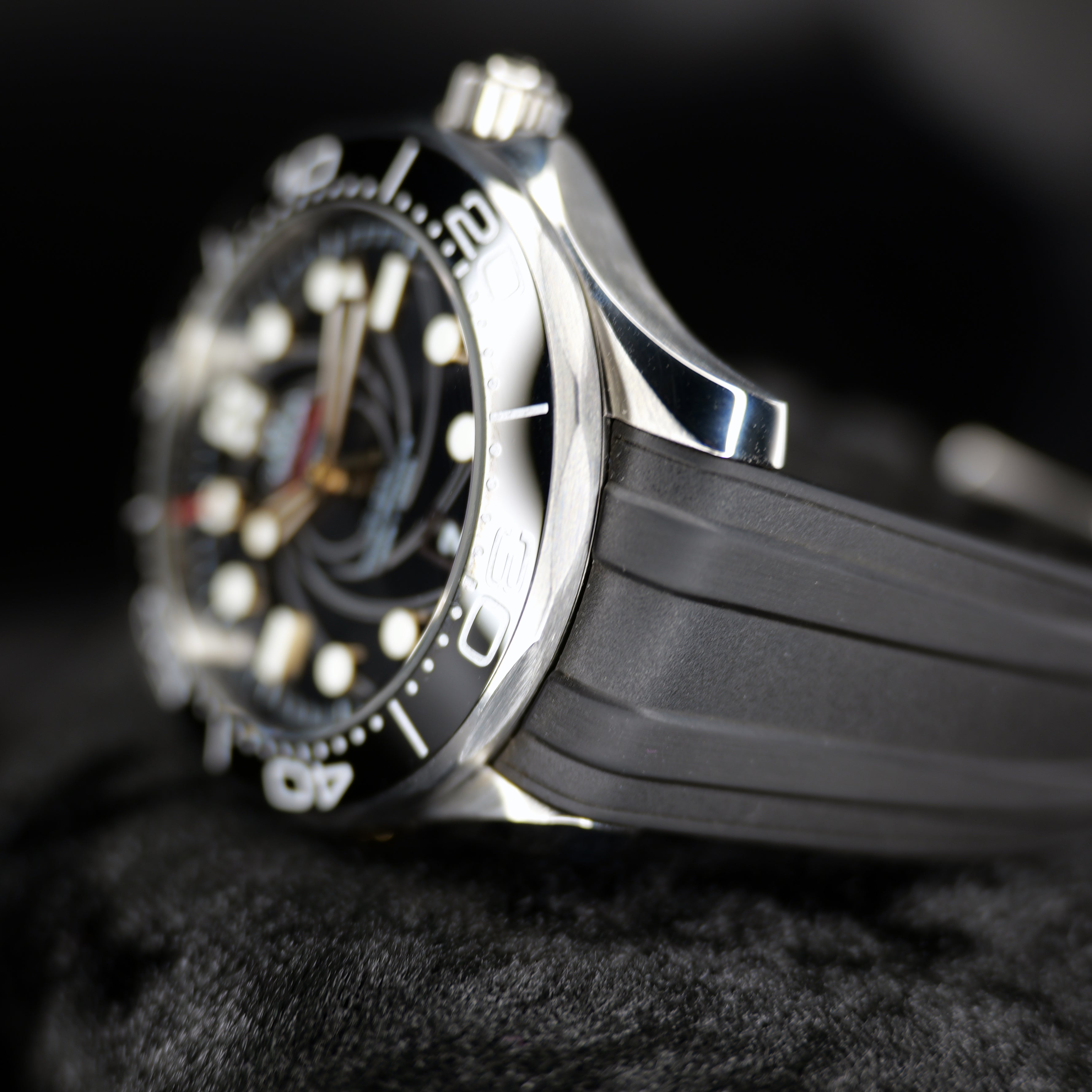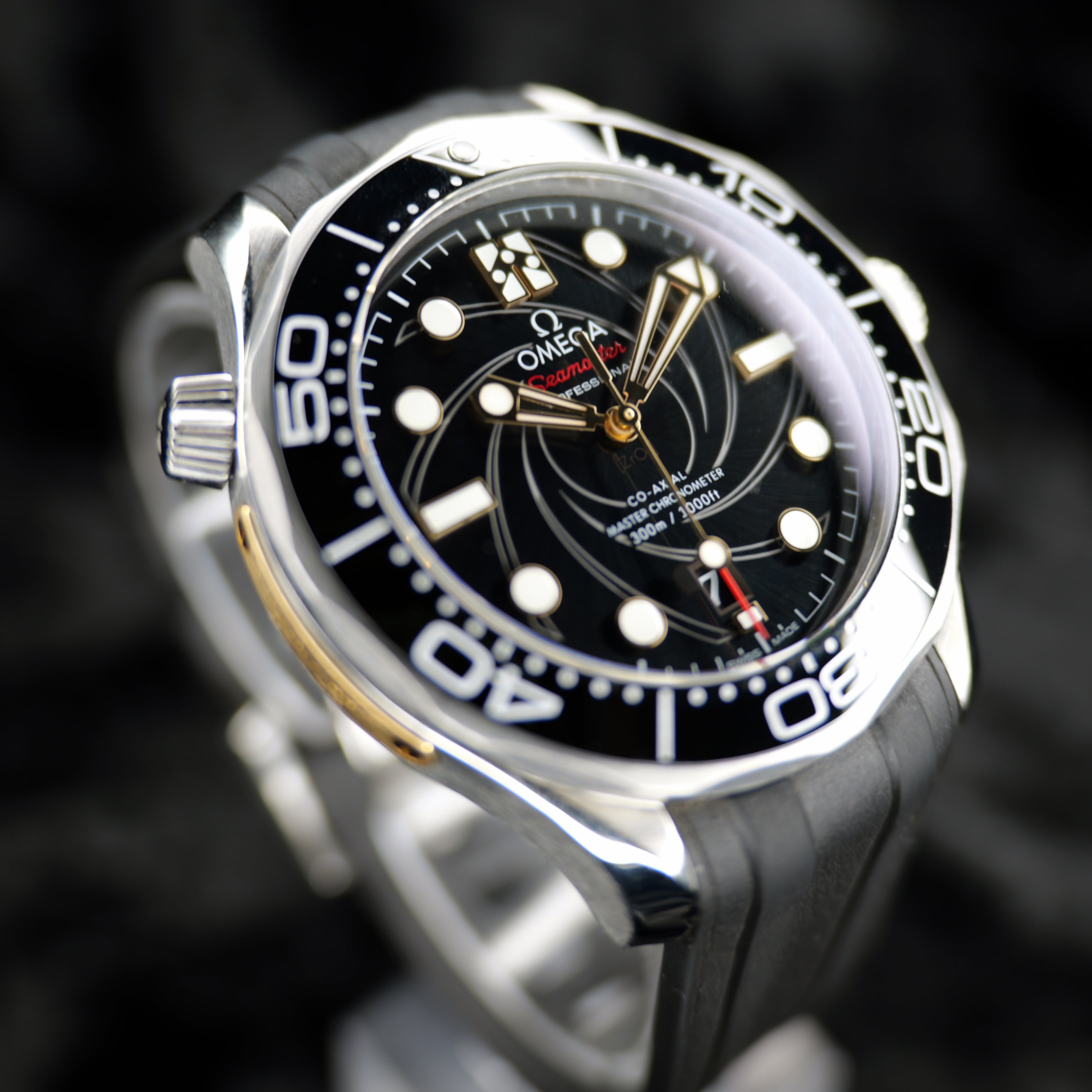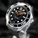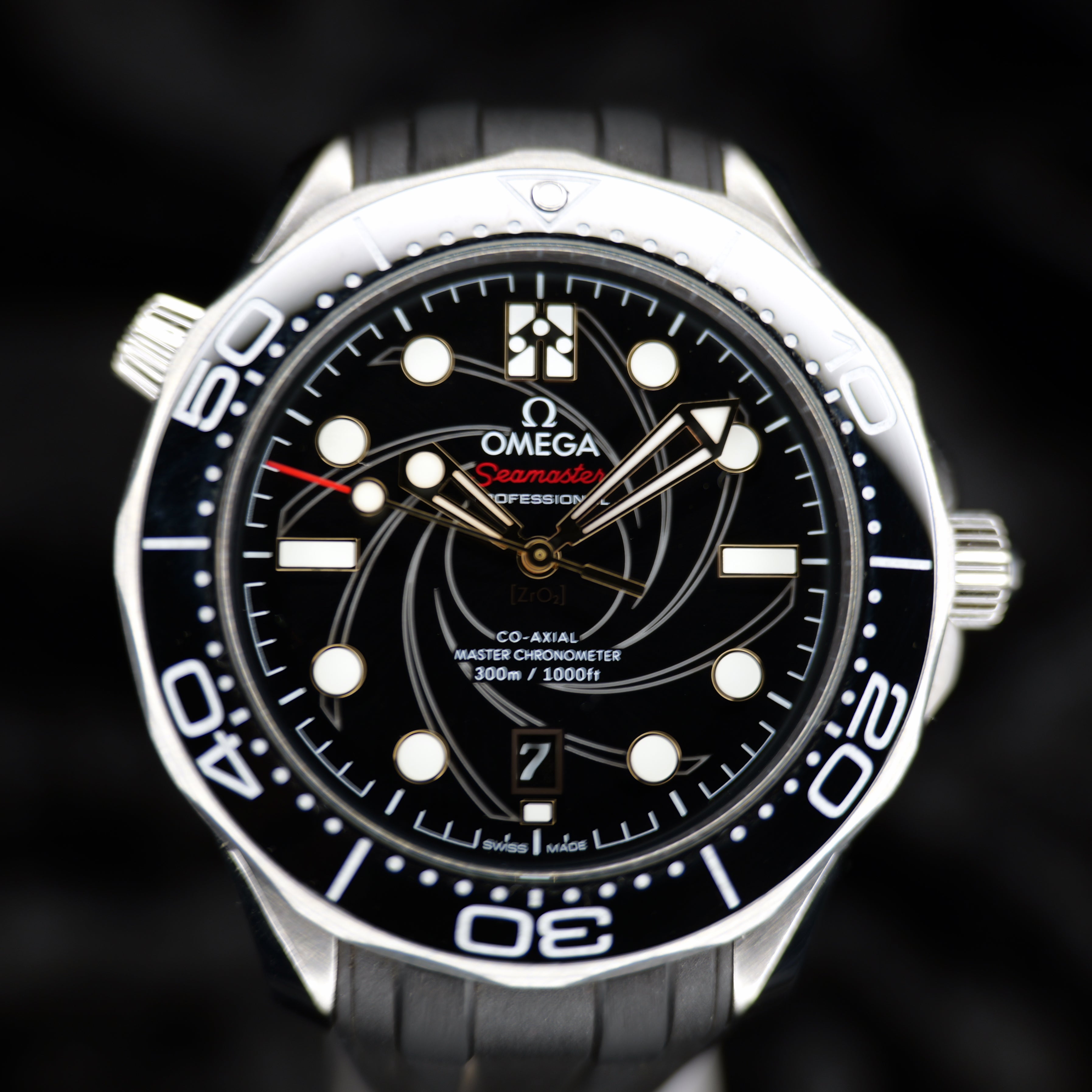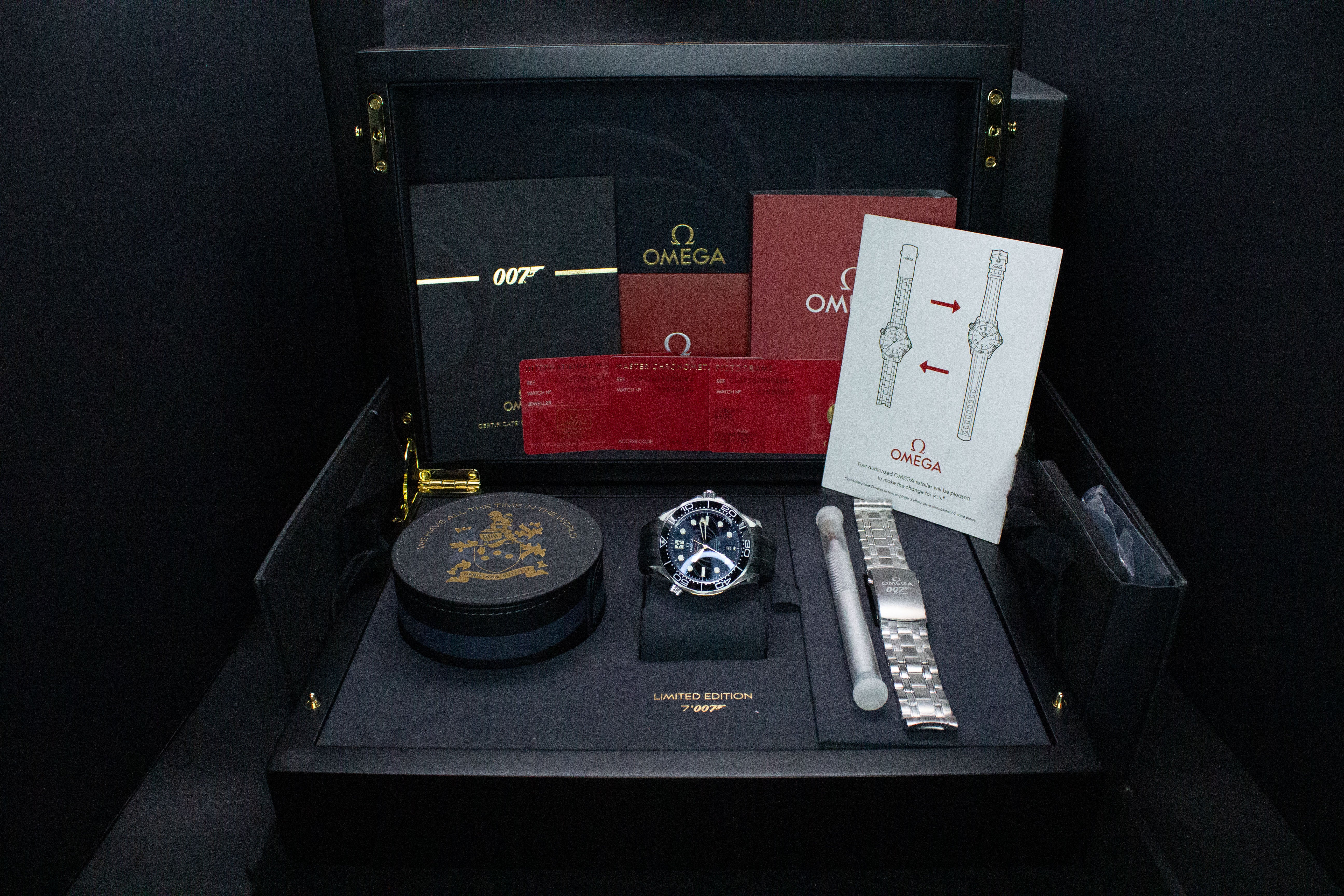 Up for sale is the Omega Seamaster James Bond 210.22.42.20.01.004 42MM Steel Black Dial with 007 certificate of authenticity, International warranty card, master chronometer, and pictograms cards, microfiber cloth, travel case, strap tool, 007 bracelet fitted to 7.75 inches, and is double boxed. Watch is dated 2020. It was recently placed on a timegrapher and is running well. All of our watches are photographed under high intensity light with a macro lens. Any flaws will be significantly magnified. The serial numbers have been blurred for privacy. Timepiece is in excellent condition showing little to no signs of wear. Timepiece is located in Indiana.