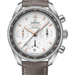 38 mm stainless steel case, dual bezel with a tachymeter scale on a grey aluminium ring while the outside is diamond-paved, scratch-resistant sapphire crystal anti-reflective treatment on both sides, opaline silvery dial includes horizontal oval subdials and a vertical oval date window at 6 o’clock, tachymeter scale, Caliber Omega 3330 self winding movement with chronograph, chronometer, date, approximately 52 hours of power reserve, taupe-brown leather strap. Water resistant to 10 bar (100 metres / 330 feet).