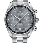 38 mm stainless steel case, bezel which includes a tachymeter scale on a black aluminium ring, scratch-resistant sapphire crystal anti-reflective treatment on both sides, sun-brushed grey dial includes horizontal oval subdials and a vertical oval date window at 6 o’clock, tachymeter scale, Caliber Omega 3330 self winding movement with chronograph, chronometer, date, approximately 52 hours of power reserve, stainless steel bracelet. Water resistant to 10 bar (100 metres / 330 feet).