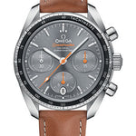 38 mm stainless steel case, bezel which includes a tachymeter scale on a black aluminium ring, scratch-resistant sapphire crystal anti-reflective treatment on both sides, sun-brushed grey dial includes horizontal oval subdials and a vertical oval date window at 6 o’clock, tachymeter scale, Caliber Omega 3330 self winding movement with chronograph, chronometer, date, approximately 52 hours of power reserve, Novo Nappa leather strap. Water resistant to 10 bar (100 metres / 330 feet).
