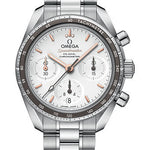 38 mm stainless steel case, bezel which includes a tachymeter scale on a grey aluminium ring, scratch-resistant sapphire crystal anti-reflective treatment on both sides, opaline silvery dial includes horizontal oval subdials and a vertical oval date window at 6 o’clock, tachymeter scale, Caliber Omega 3330 self winding movement with chronograph, chronometer, date, approximately 52 hours of power reserve, stainless steel bracelet. Water resistant to 10 bar (100 metres / 330 feet).