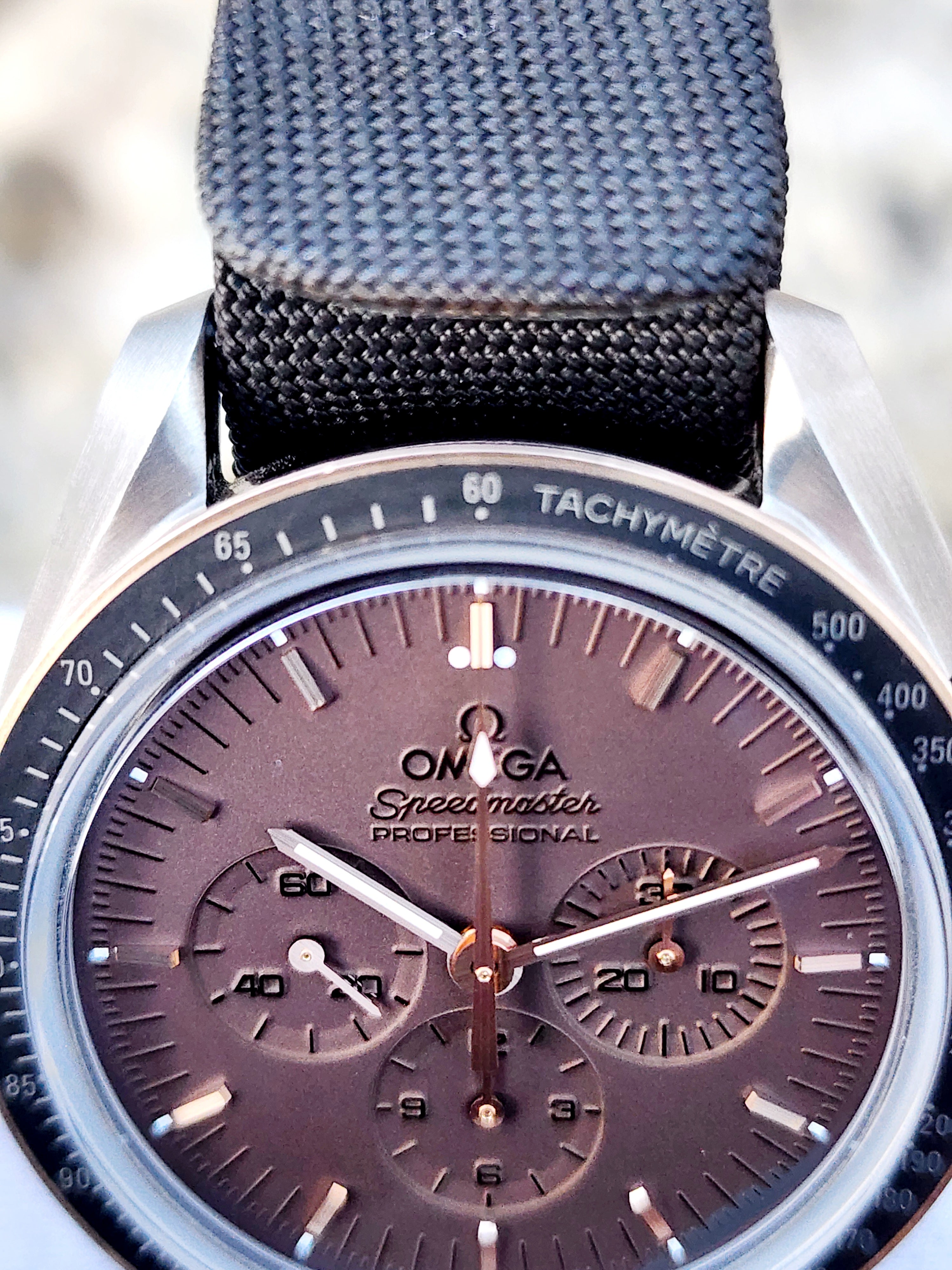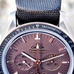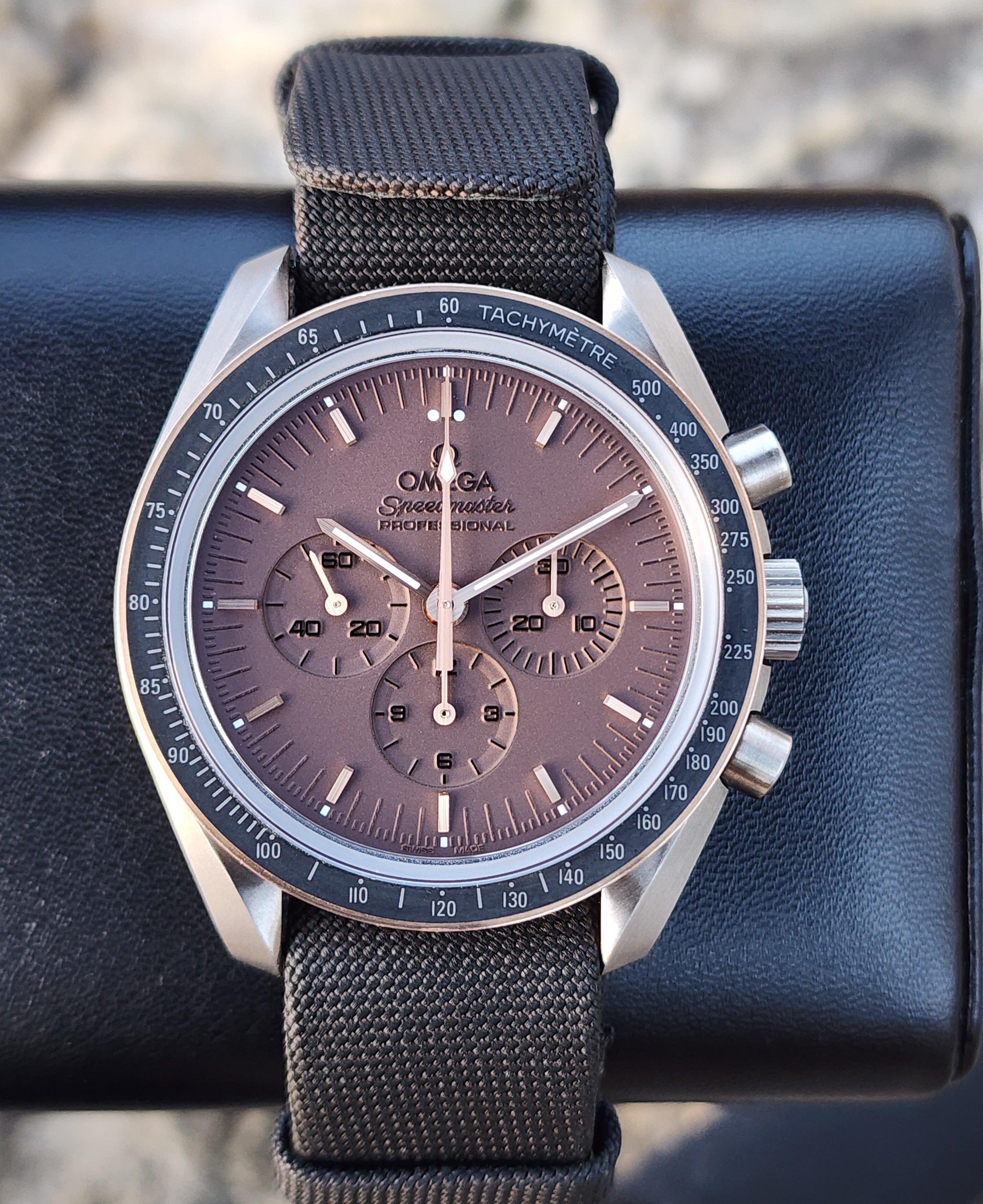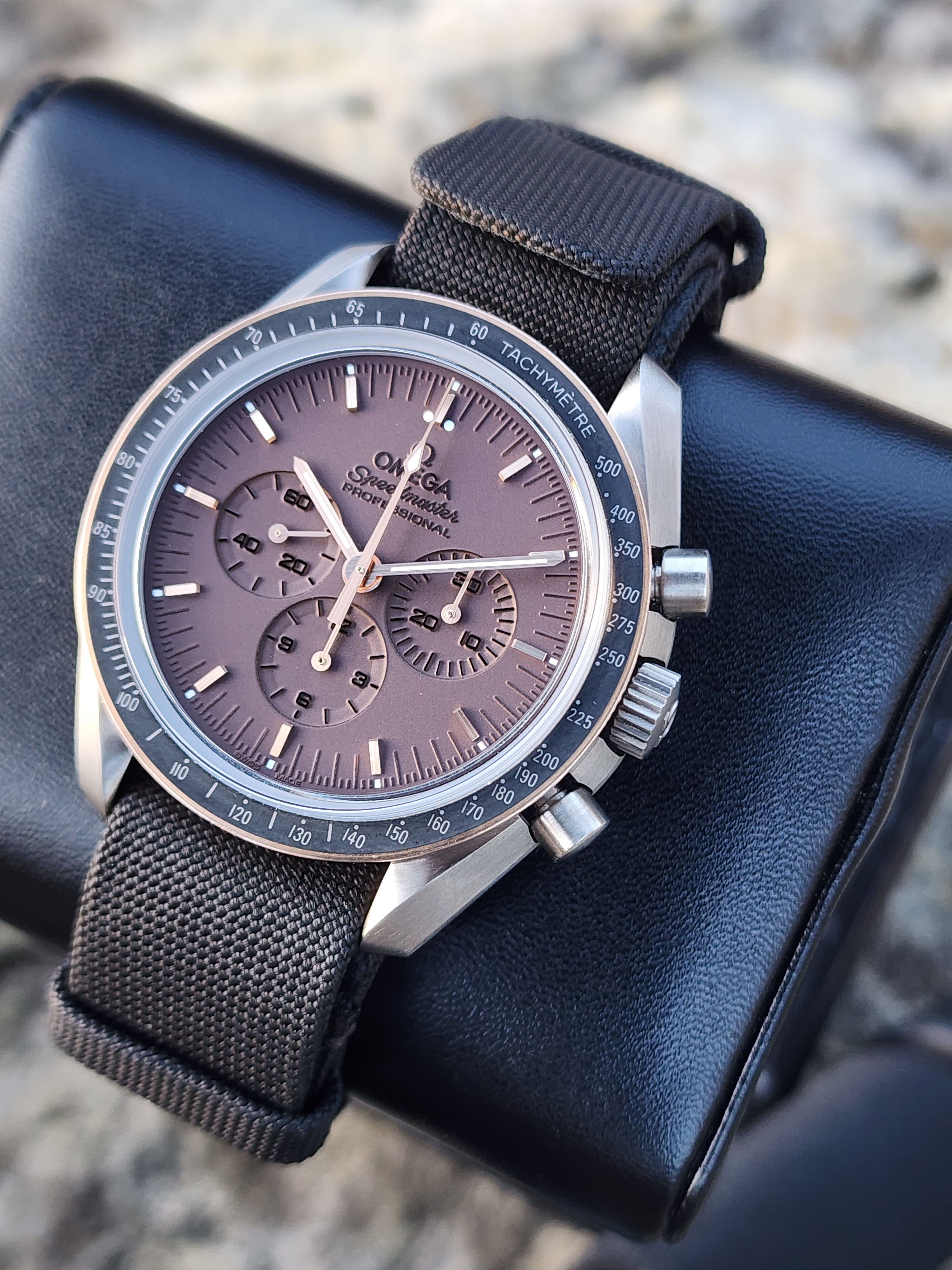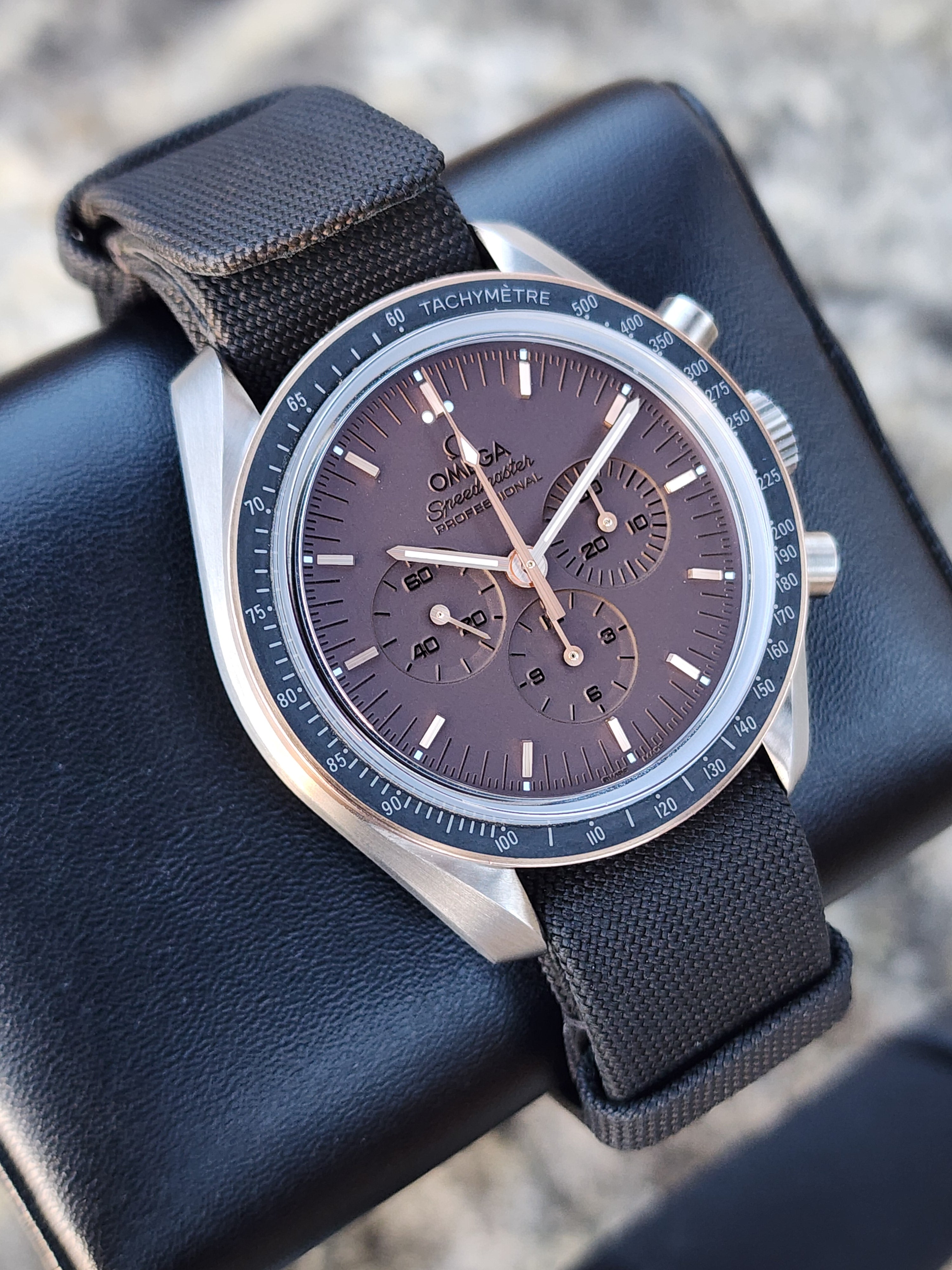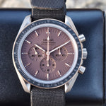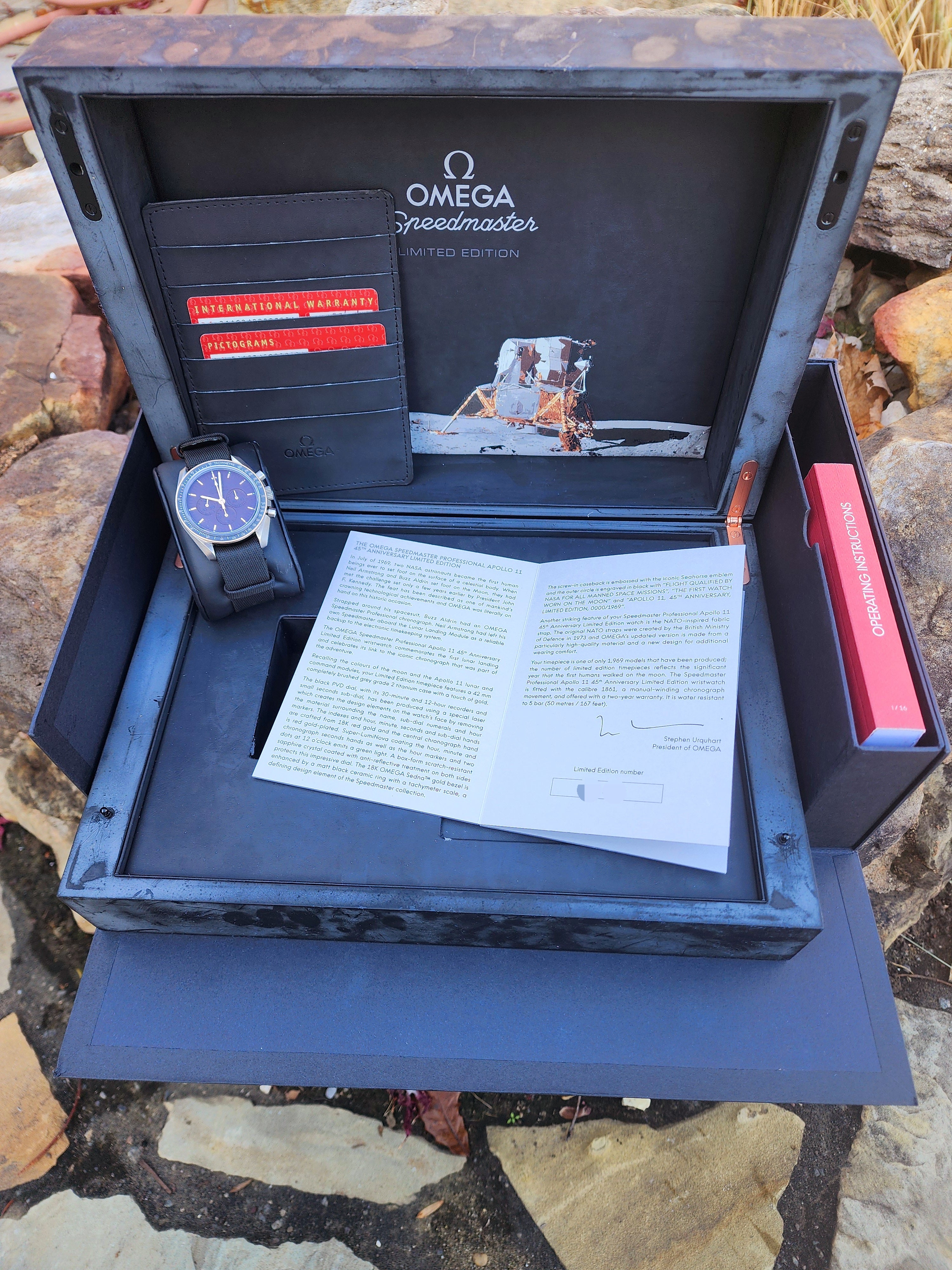 Up for sale is the Omega Speedmaster Apollo 11 45th Anniversary Titanium Sedna Gold Burgundy Dial. A Limited Edition series of 1,969 pieces, this timepiece commemorates the first lunar landing & comes complete with outer-box, special inner-box, Instruction book, International warranty card, Pictograms card, certificate of authenticity book & brown coated nylon fabric NATO strap. Timepiece is dated 2015. MSRP $16,000. It was recently placed on a timegrapher and is running well. Do excuse the dust/lint in the pictures as all of our watches are photographed outdoors in natural lighting/conditions. The serial numbers have been blurred for privacy. This timepiece is in excellent condition with no signs of wear. Certificate of authenticity book has a slight tear on the front. Timepiece is located in Indiana.