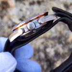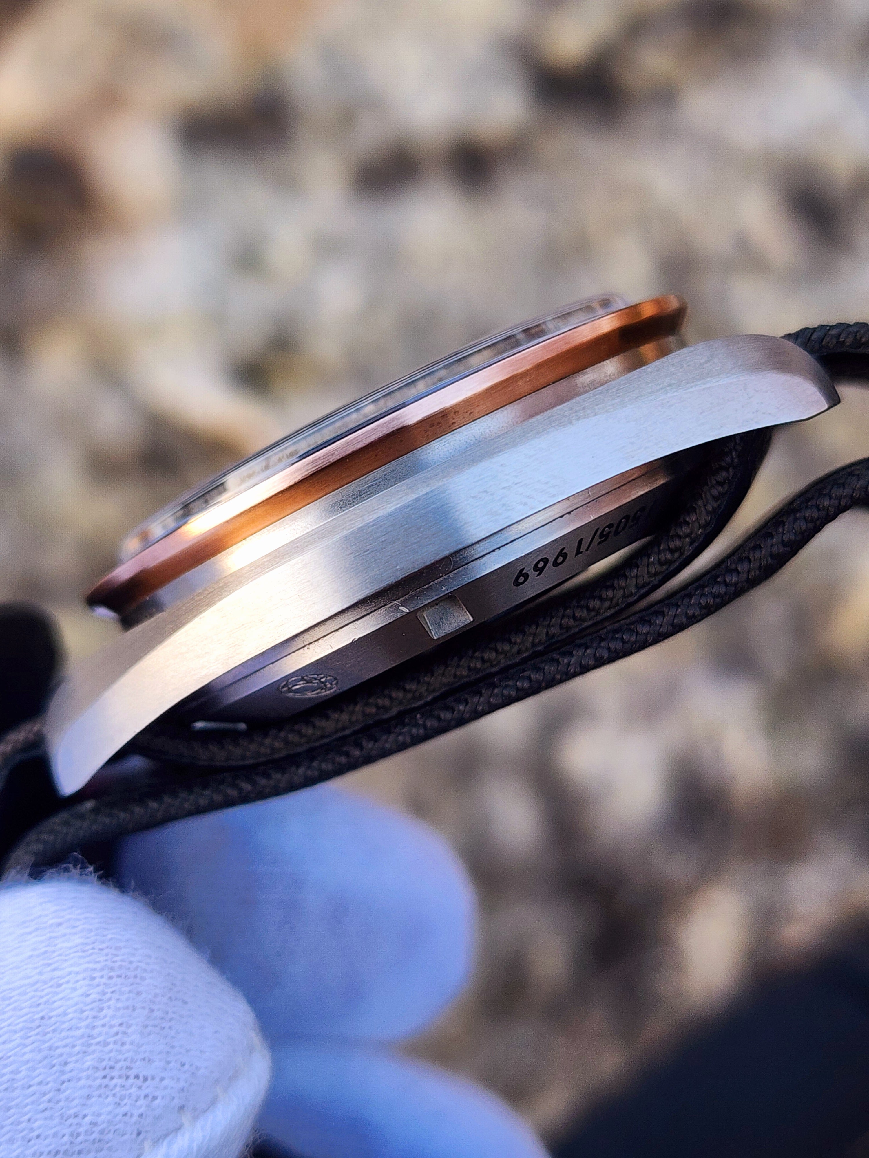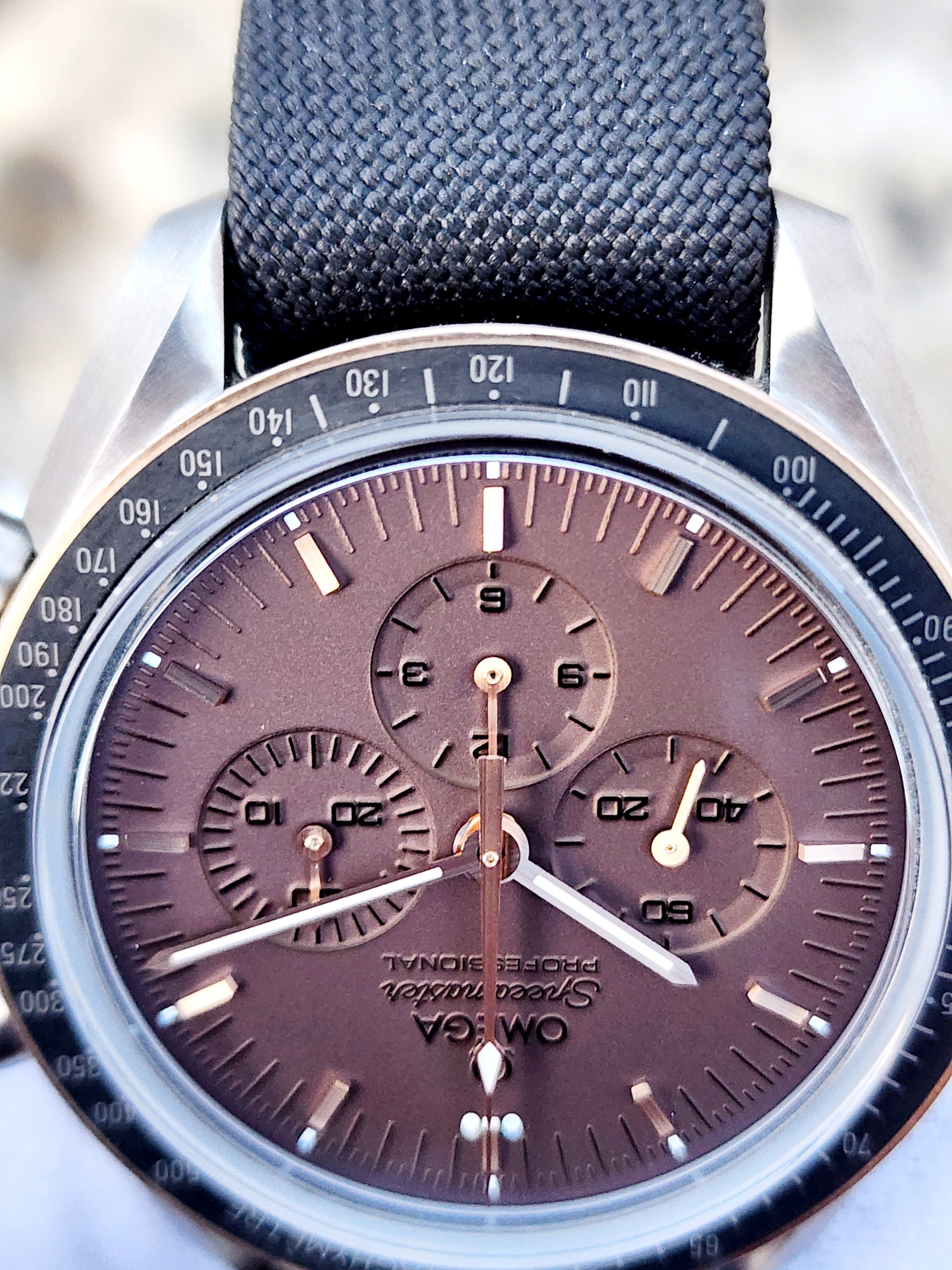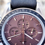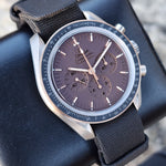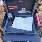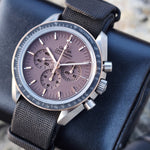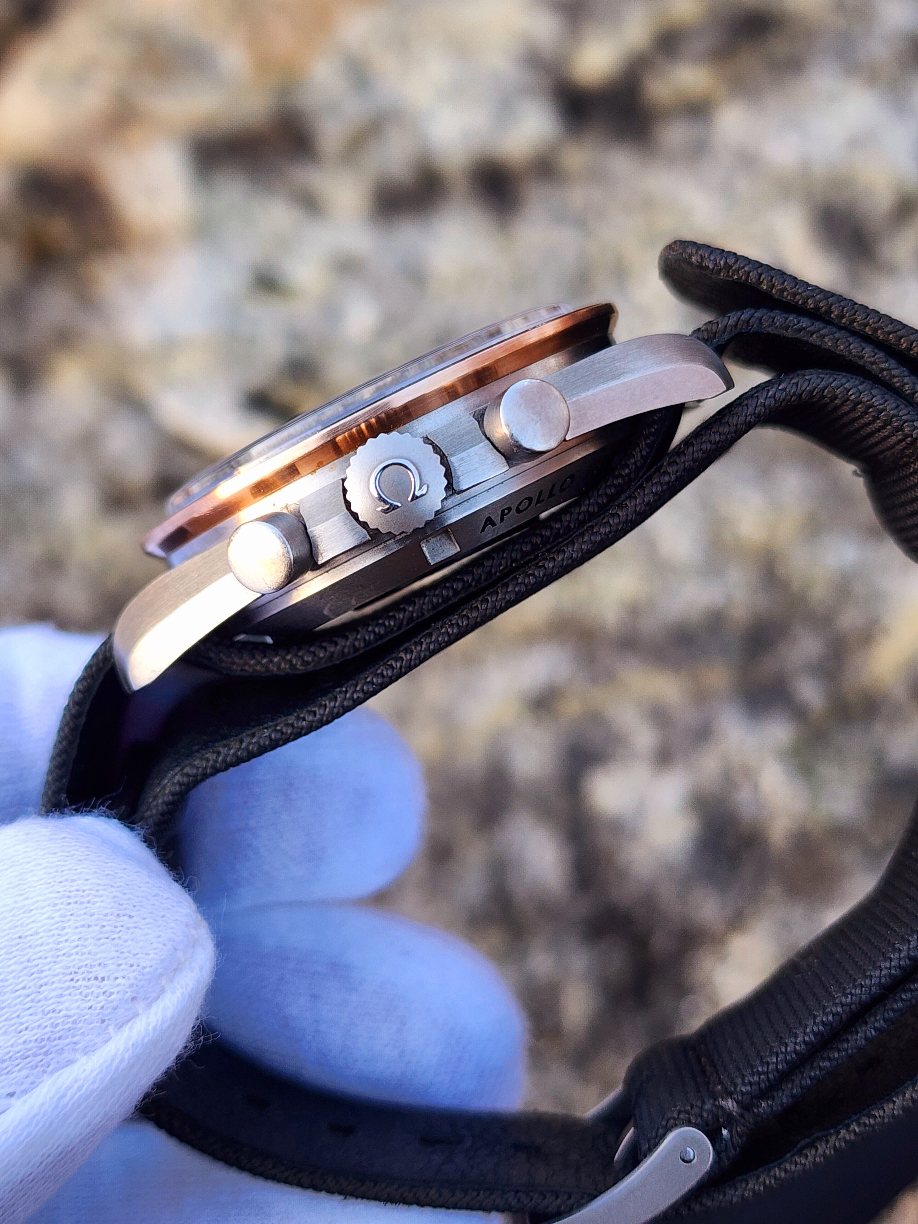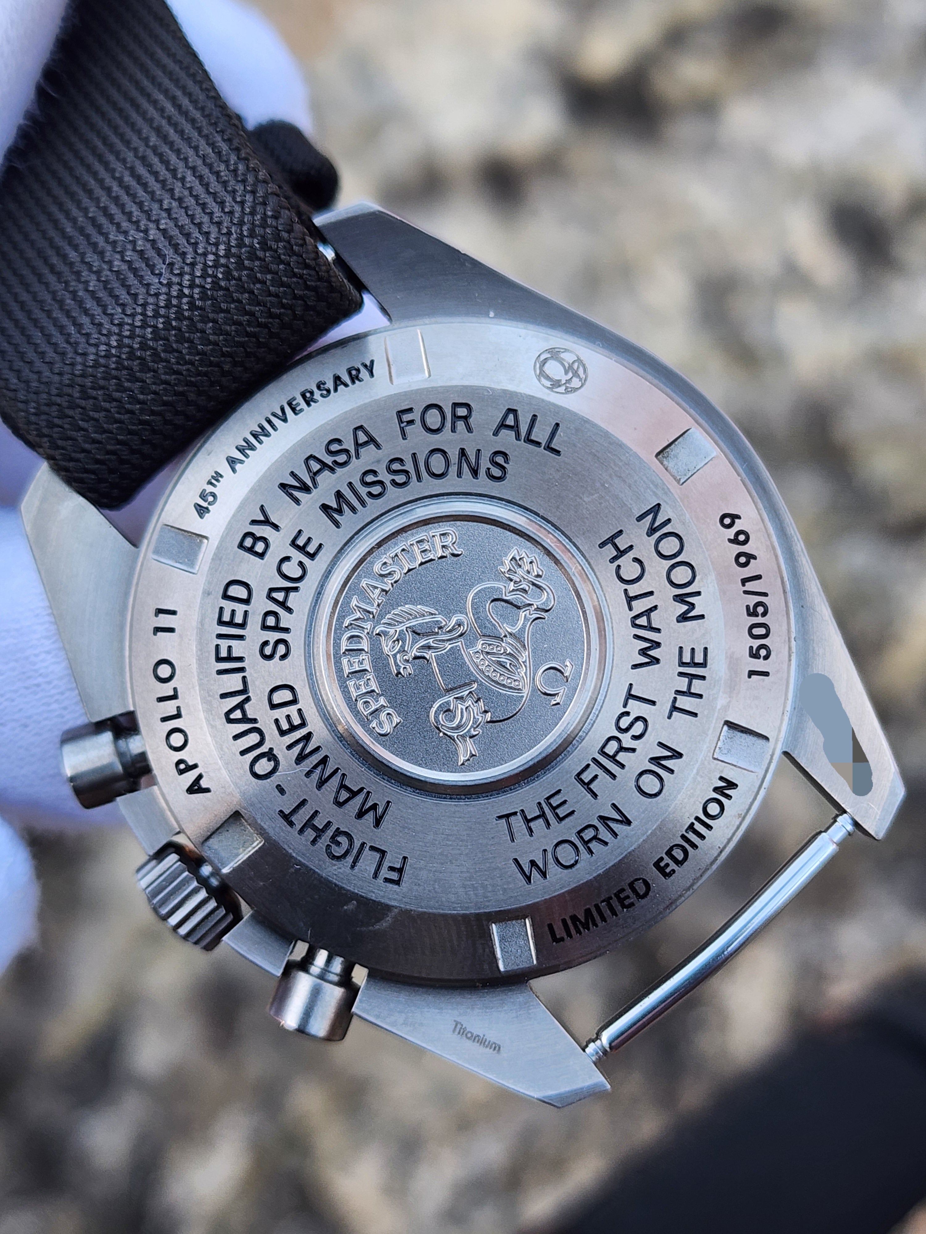 Up for sale is the Omega Speedmaster Apollo 11 45th Anniversary Titanium Sedna Gold Burgundy Dial. A Limited Edition series of 1,969 pieces, this timepiece commemorates the first lunar landing & comes complete with outer-box, special inner-box, Instruction book, International warranty card, Pictograms card, certificate of authenticity book & brown coated nylon fabric NATO strap. Timepiece is dated 2015. MSRP $16,000. It was recently placed on a timegrapher and is running well. Do excuse the dust/lint in the pictures as all of our watches are photographed outdoors in natural lighting/conditions. The serial numbers have been blurred for privacy. This timepiece is in excellent condition with no signs of wear. Certificate of authenticity book has a slight tear on the front. Timepiece is located in Indiana.