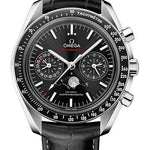 44.25 mm stainless steel case with anti-magnetic properties, transparent back, screw-in crown, black liquid metal bezel with tachymeter scale, scratch-resistant sapphire crystal with anti-reflective treatment on both sides, black sun-brushed dial, caliber 9904 self-winding Co-Axial master chronometer movement with chronograph and moonphase indication, approximately 60 hours of power reserve, black leather strap. Water resistant to 100 m (330 ft).