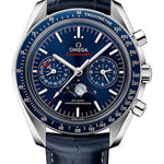 44.25 mm stainless steel case with anti-magnetic properties, transparent back, screw-in crown, blue liquid metal bezel with tachymeter scale, scratch-resistant sapphire crystal with anti-reflective treatment on both sides, blue dial, caliber 9904 self-winding Co-Axial master chronometer movement with chronograph and moon functions, approximately 60 hours of power reserve, blue leather strap. Water resistant to 100 m (330 ft).