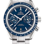 44.25 mm stainless steel case, transparent back, blue tachymeter bezel, scratch-resistant sapphire crystal with anti-reflective treatment on both sides, blue dial, self-winding chronometer Omega 9300 movement with Co-Axial Escapement, chronograph, date, and small seconds, approximately 60 hours of power reserve, stainless steel bracelet. Water resistant to 100 m.
