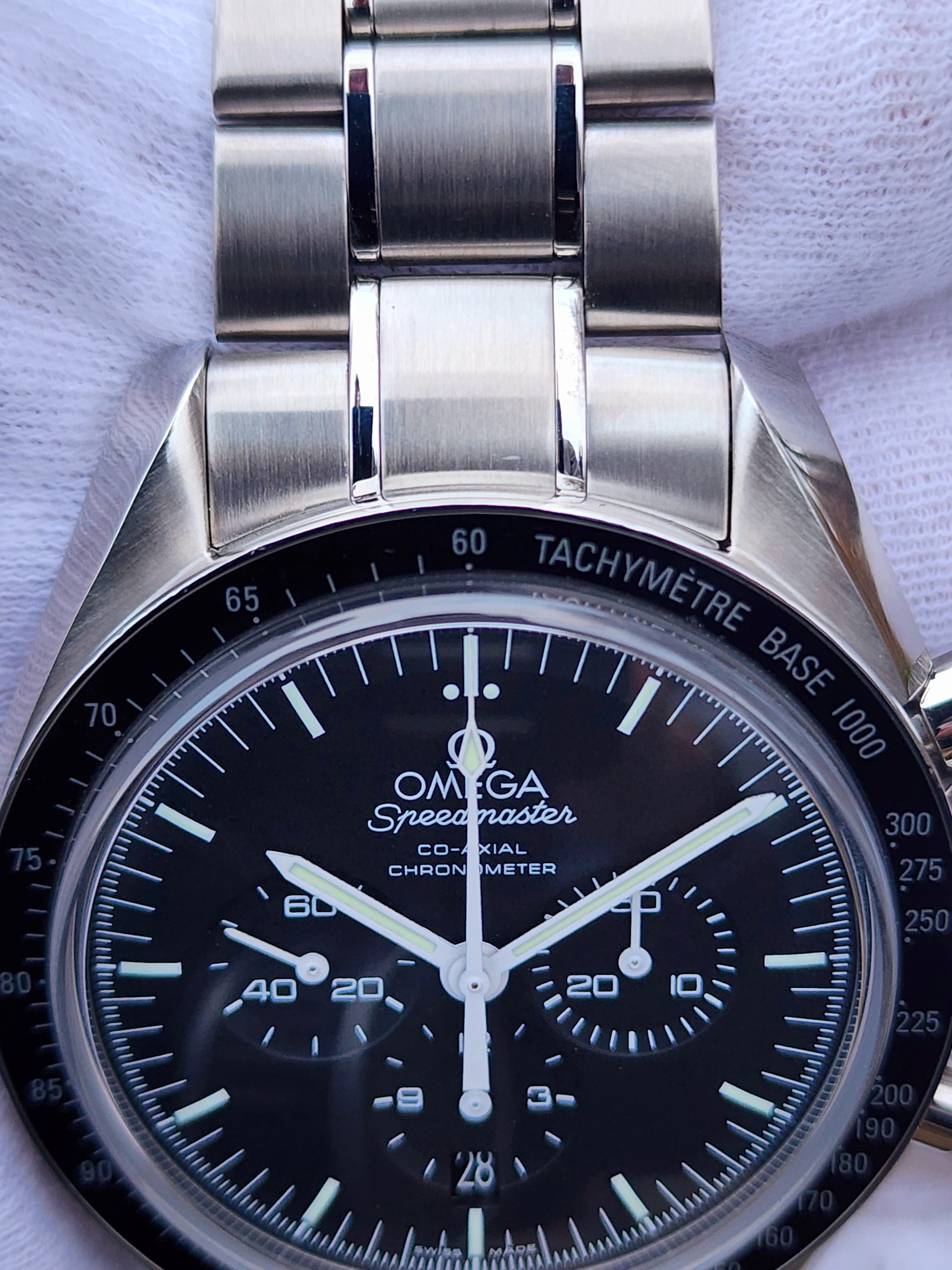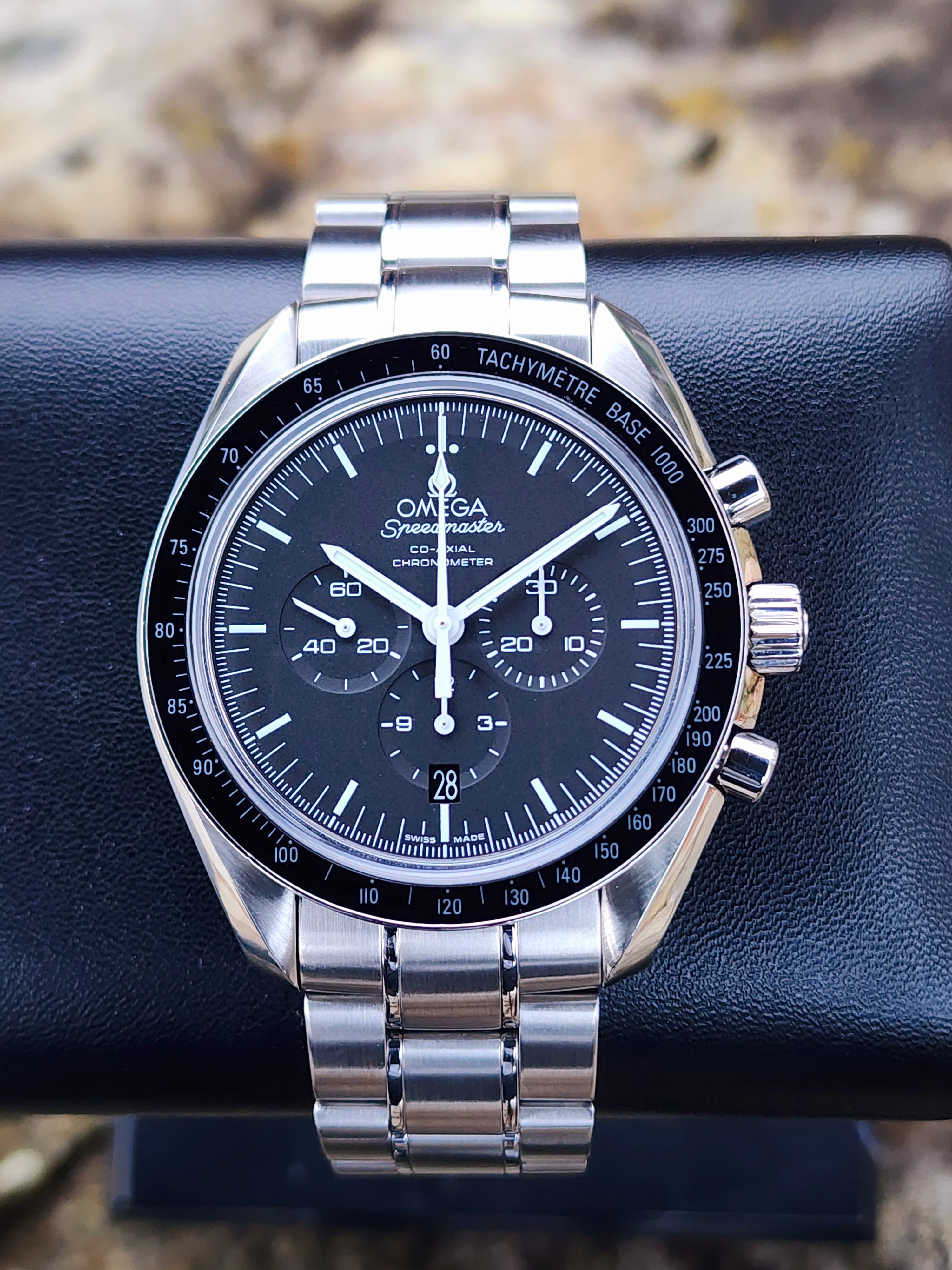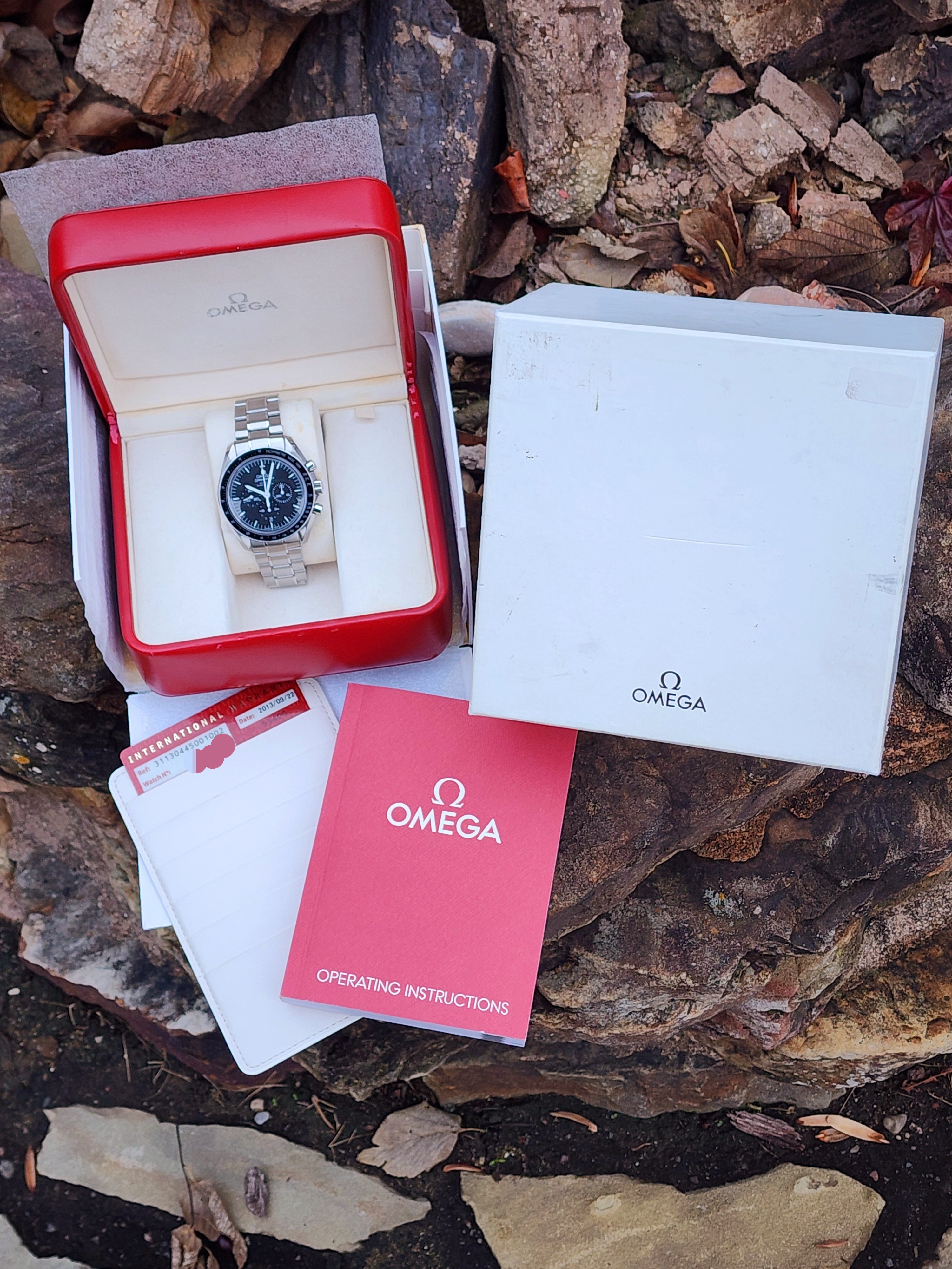 Up for sale is the Omega Speedmaster Moonwatch Co-Axial featuring the rare combination of both a Chronograph & Date function, reference 311.30.44.50.01.002 with 44mm case size. Watch comes double-boxed with Operating Instructions and warranty card. Timepiece is dated 2013. MSRP $8,700. It was recently placed on a timegrapher and is running well. Do excuse the dust/lint in the pictures as all of our watches are photographed outdoors in natural lighting/conditions. The serial numbers have been blurred for privacy. This timepiece is in excellent condition with little to no signs of wear. Timepiece is located in Indiana.