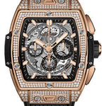 42 mm polished 18k king gold case set with 166 diamonds, polished 18K king gold bezel set with 164 diamonds totaling 0.90ct with, 6 H-shaped titanium screws, sapphire crystal with anti-reflective treatment, sapphire dial, HUB4700 self-winding skeleton chronograph movement, approximately 50 hours of power reserve, black structured lined rubber strap, 18K king gold and black-plated titanium deployant buckle. Water resistant to 100m (10 ATM).
