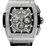 42 mm satin-finished and polished titanium case, satin-finished, polished and microblasted titanium bezel with 6 h-shaped titanium screws, sapphire crystal with anti-reflective treatment, sapphire dial, HUB4700 self-winding skeleton chronograph movement, approximately 50 hours of power reserve, black rubber and alligator leather strap, titanium deployant buckle. Water resistant to 100m (10 ATM).