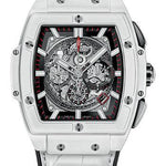 45 mm microblasted and polished white ceramic case, microblasted and polished white ceramic bezel, sapphire crystal with anti-reflective treatment, sapphire dial, HUB4700 self-winding skeleton chronograph movement, approximately 50 hours of power reserve, black rubber and white alligator strap, titanium deployant buckle. Water resistant to 100m (10 ATM).