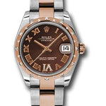 31mm stainless steel case, 18K pink gold domed bezel set with 24 diamonds, chocolate diamond Roman VI dial, Roman numerals with 11 diamonds set on VI, and stainless steel and 18K pink gold Oyster bracelet.
