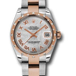 31mm stainless steel case, 18K pink gold domed bezel set with 24 diamonds, mother of pearl dial, Roman numerals, and stainless steel and 18K pink gold Oyster bracelet.