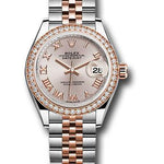 28mm Everose Rolesor case comprised of a 904L steel monobloc middle case, screw-down steel back, 18K Everose gold screw-down crown with twinlock double waterproofness system, 18K Everose gold diamond bezel, scratch-resistant sapphire crystal with cyclops lens over the date and double anti-reflective coating, sundust dial, Roman numerals, Rolex calibre 2236 automatic movement with center hour, minute and seconds hands, instantaneous date with rapid setting, and stop-seconds for precise time setting, Everose Rolesor Jubilee bracelet comprised of a combination of 904L steel and 18K Everose gold in five-piece links, concealed folding Crownclasp buckle. Waterproof to 100 meters.