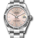 31mm white Rolesor case comprised of Oystersteel and 18K white gold, screw-down back, screw-down crown with twinlock double waterproofness system, 18K white gold fluted bezel, scratch-resistant sapphire crystal with cyclops lens over the date, pink dial, index hour markers, Rolex calibre 2236 perpetual self-winding movement with date at 3 o'clock, approximately 55 hours of power reserve, Oystersteel Oyster bracelet with flat three-piece links, concealed folding Oysterclasp buckle. Waterproof to 100 meters.