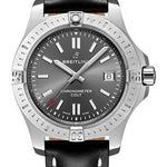 41.00 mm steel case, 10.70 mm thick, screw-locked crown with two gaskets, unidirectional ratcheted bezel, sapphire crystal with glareproof treatment on both sides, tempest gray dial, Breitling 17 self-winding movement, approximately 38 hrs of power reserve, black leather strap, folding buckle. Water resistant to 200 m (660 ft).