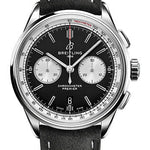 42.00 mm stainless steel case, 13.65 mm thick, transparent sapphire crystal back, non screw-locked crown with two gaskets, cambered sapphire crystal with glareproof treatment on both sides, black dial, Breitling 01 (Manufacture) self-winding movement, approximately approx. 70 hrs of power reserve, anthracite calfskin leather strap, folding buckle. Water resistant to 100 m (330 ft).
