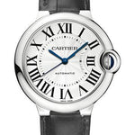 36.6 mm by 12 mm thick stainless steel case, stainless steel fluted crown set with a blue synthetic spinel cabochon, sapphire crystal, silver dial with Roman numerals and blued steel hands, caliber Cartier 076 automatic movement, black alligator strap. Water resistant to 30 meters.