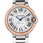 36 mm stainless steel case, 18K pink gold fluted crown set with a synthetic cabochon-shaped spinel, 18K pink gold bezel set with 58 brilliant-cut diamonds (~0.73 carats), sapphire crystal, guilloche and lacquered dial with Roman numerals, self-winding caliber Cartier 076 movement, stainless steel bracelet. Water resistant to 30 meters.