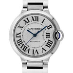Medium size (36.6mm) stainless steel case, silvered opaline and guilloche dial with Roman numerals, automatic winding Cartier calibre 076 movement, stainless steel bracelet. Water resistant to 30 meters.