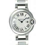 Small size (28.6mm) stainless steel case, silver opaline lacquered dial with Roman numerals, quartz Cartier calibre 057 movement, stainless steel bracelet. Water resistant to 30 meters.