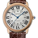 42 mm by 8.36 mm thick 18K pink gold and stainless steel case, 18K pink gold beaded crown set with a synthetic spinel cabochon, sapphire crystal, silver dial with 12 Roman numerals and blued steel hands, caliber Cartier 049 automatic movement, matt brown alligator strap with 18K pink gold buckle. Water resistant to 30 meters.
