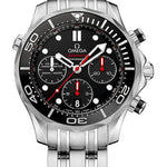 41.5 mm stainless steel case, screw-in crown, unidirectional rotating bezel, domed scratch-resistant sapphire crystal with anti-reflective treatment on both sides, black dial, self-winding chronometer Omega 3330 movement with chronograph, small seconds, and date, approximately 52 hours of power reserve, stainless steel bracelet. Water resistant to 300 m.