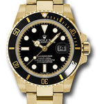 40mm 18K yellow gold case, black time lapse Cerachrom bezel, black dial, and Oyster Glidelock bracelet. Water resistant to 1000 feet.