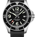 42.00 mm steel case, 13.30 mm thick, screw-locked crown with two gaskets, unidirectional ratcheted bezel, cambered sapphire crystal with glareproof treatment on both sides, black dial, Breitling 17 self-winding movement, approximately 38 hrs of power reserve, black diver pro III strap, tang buckle. Water resistant to 500 m (1,650 ft).
