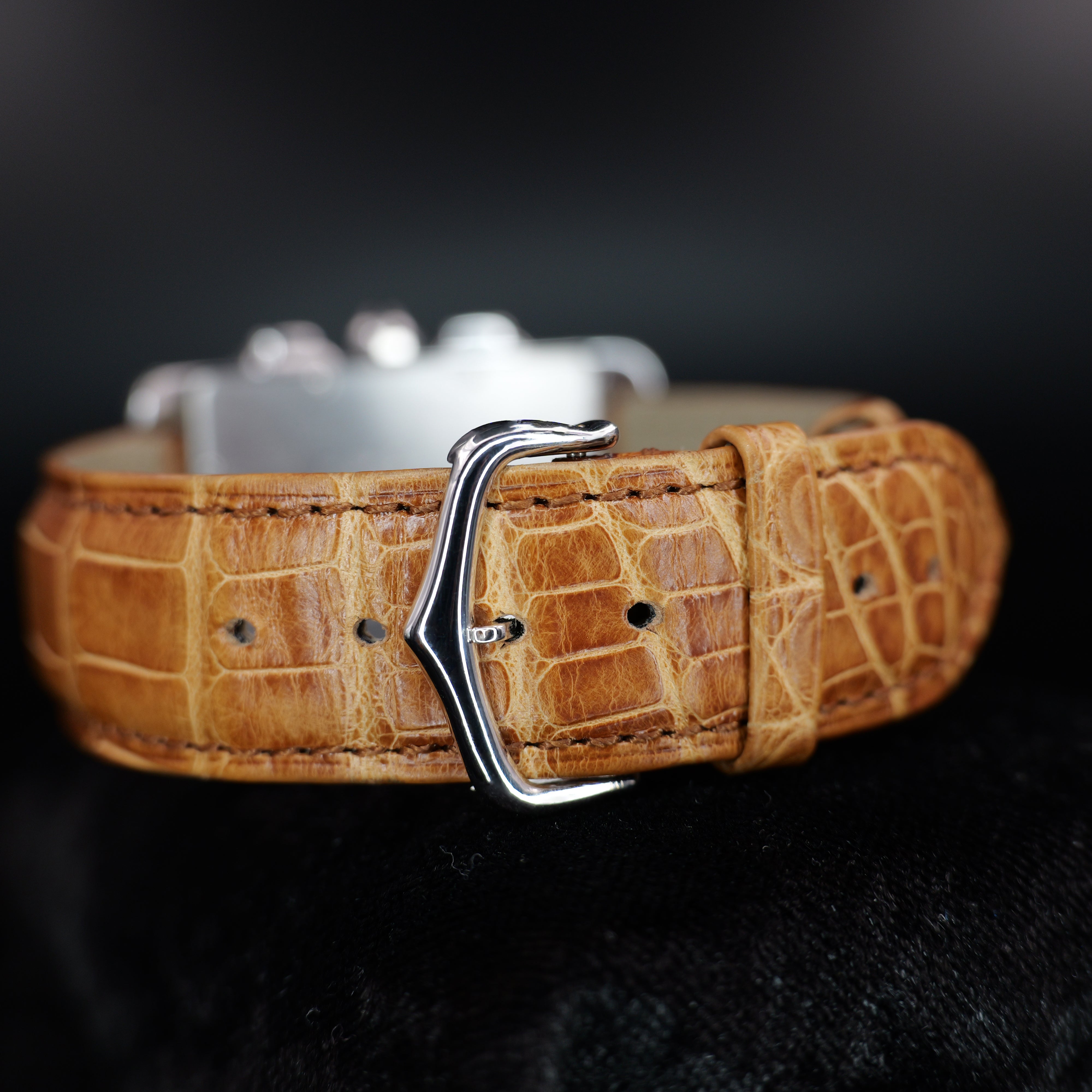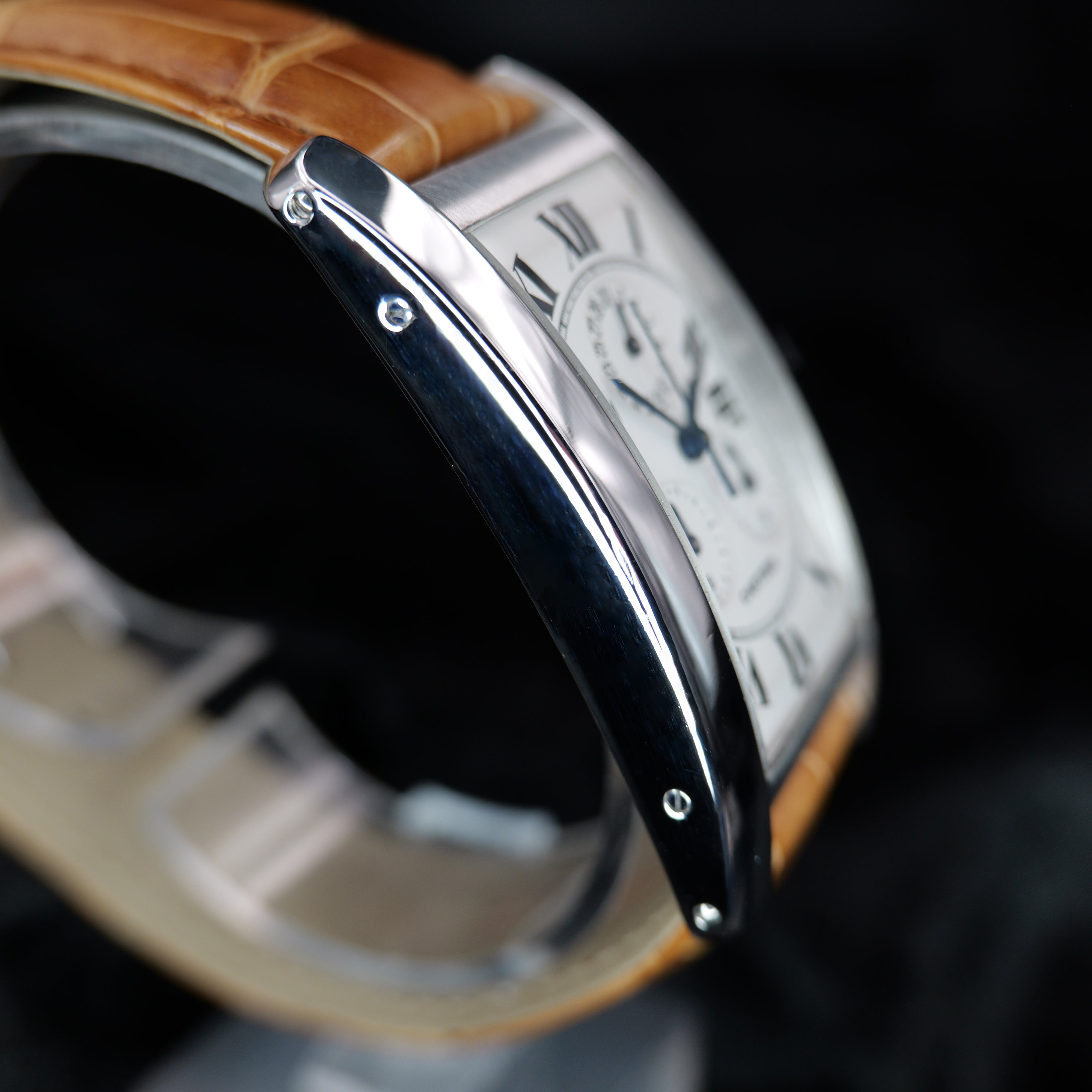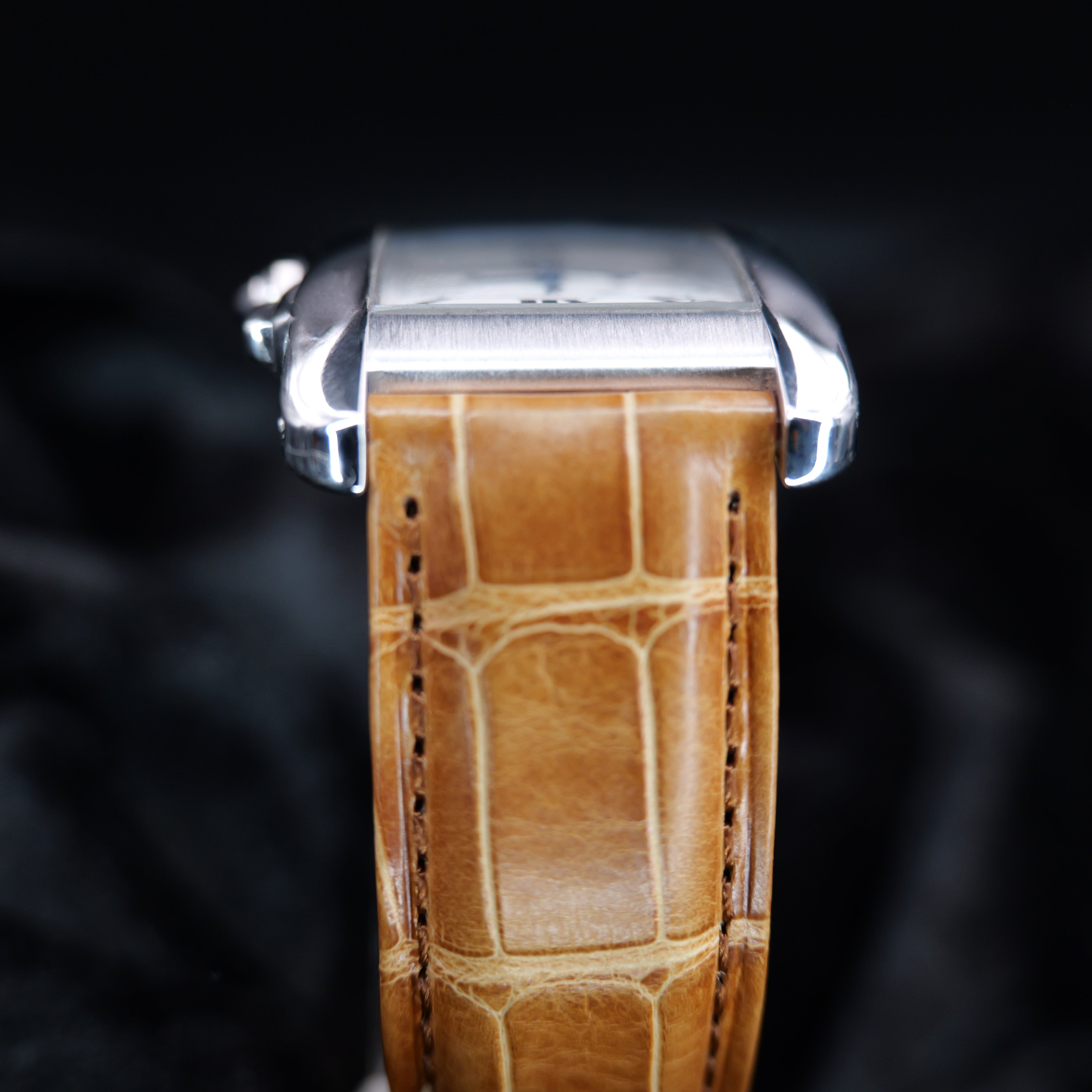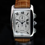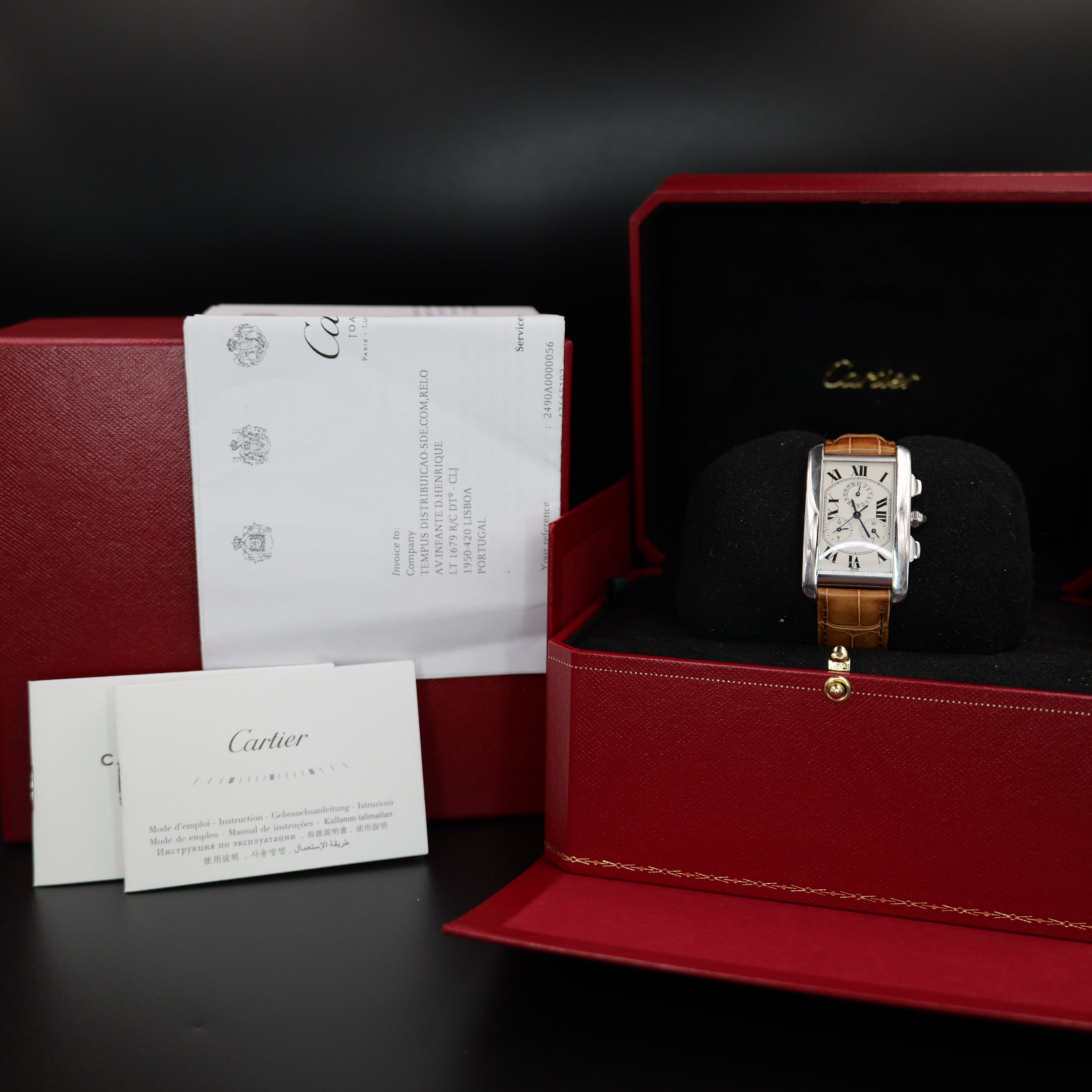 Up for sale is the Cartier Tank Americaine Chronograph 2312 26MM x 45MM White Gold White Dial with Instructions booklet, care booklet, service records, service receipt, and is double boxed. It was recently placed on a timegrapher and is running well. All of our watches are photographed under high intensity light with a macro lens. Any flaws will be significantly magnified. The serial numbers have been blurred for privacy. Timepiece is in excellent condition showing little to no signs of wear. Timepiece is located in Indiana.