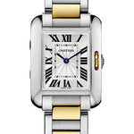 30.2 x 22.7mm stainless steel case, 7.19mm thick, 18K yellow gold crown set with a synthetic spinel cabochon, sapphire crystal, silver dial with Roman Numerals and blued-steel sword-shaped hands, quartz movement, 18K yellow gold and stainless steel bracelet. Water resistant to 30 meters.