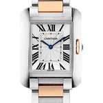 34.7mm x 26.2mm steel case, 7.1mm thick, 9-sided crown set with a synthetic spinel, steel bezel, silver dial with flinque, quartz movement with blued-steel sword-shaped hands, 18K pink gold bracelet. Water resistant to 30 metres.