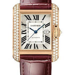 39.2mm x 29.8mm 18K pink gold case set with diamonds, 9.5mm thick, nine sided crown with a cut diamond, sapphire crystal, silvered dial with blued steel hands, caliber Cartier 077 automatic movement, claret red alligator strap, double adjustable deployant buckle with 18K pink gold. Water resistant to 30 meters.