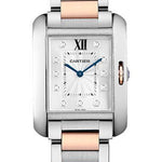 Medium size (34.7mm x 26.2mm) stainless steel case, 7.1mm thick, 18K pink gold crown set with a synthetic spinel, sapphire crystal, silvered flinque dial with 11 brilliant-cut diamond hour markers, Roman numeral, and blued-steel sword-shaped hands, quartz movement, 18K pink gold and stainless steel bracelet. Water resistant to 30 meters.