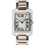 Small size (30.2mm x 22.7mm) stainless steel and 18K pink gold case, nine-sided crown set with a synthetic spinel cabochon, sapphire crystal, slivered and lacquered flinque dial with Roman numerals and sword-shaped blued-steel hands, quartz caliber Cartier 057 movement, stainless steel and 18K pink gold bracelet. Water resistant to 30 meters. (Old Ref W5310019)