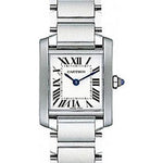 Small size, stainless steel case, silver dial, quartz movement, stainless steel bracelet. Water resistant to 30 meters (100 feet).