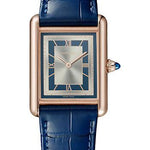 33.7 mm x 25.5 mm 18K rose gold case, beaded crown set with a sapphire cabochon, mineral crystal, silvery blue dial, calibre 1917 MC manual movement, semi-matt navy blue alligator skin strap, ardillon buckle. Water resistant to 3 bar (approx 30 metres).