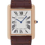 Extra large size (40.40mm x 34.92mm) 18K pink gold case, beaded crown set with a sapphire, mineral crystal, silvered grained dial with Roman numerals and sword-shaped blued-steel hands, manual winding caliber Cartier 430MC movement, brown alligator strap. Water resistant to 20 meters.