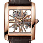 34.5mm x 43.8mm 18K pink gold case case, 9.3mm thick, sapphire back, faceted crown set with a faceted blue sapphire, 18K pink gold case bezel, sapphire crystal, skeleton dial, caliber 9619 MC manual-winding movement with gilded steel sword-shaped hands, approximately 3 days of power reserve, brown alligator skin strap, double adjustable folding buckle. Water resistant to 3 bar.