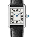 29.5 mm x 22 mm steel case, beaded crown set with a synthetic cabochon-shaped spinel, silvered dial, high autonomy quartz movement, interchangeable black grained calfskin strap, steel ardillon buckle. Water resistant to 3 bar (approx 30 meters/100 feet).